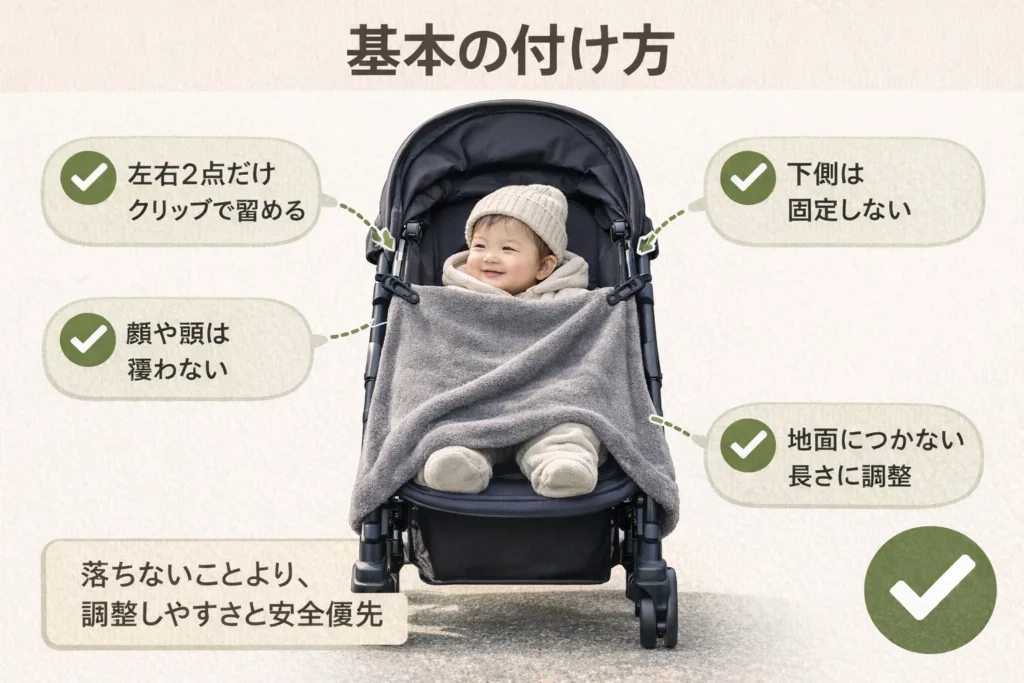 ベビーカーのブランケットの付け方で迷ったら、まずは左右2点留め+下は固定しない基本形でOKです。