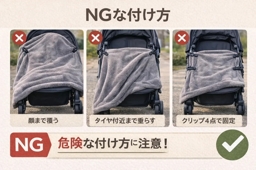 ブランケットは万能じゃないので、日よけ・蚊よけ・冷房対策なのか、防寒なのかで付け方の優先順位が変わります。必要なら別グッズに分担させるのも正解ですよ。