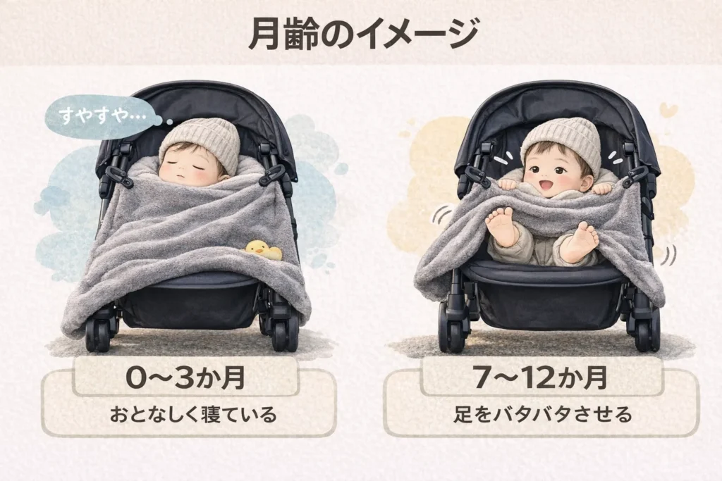 | 0〜3か月 | 動きは小さめ | 掛けすぎ注意、顔まわりは開ける |