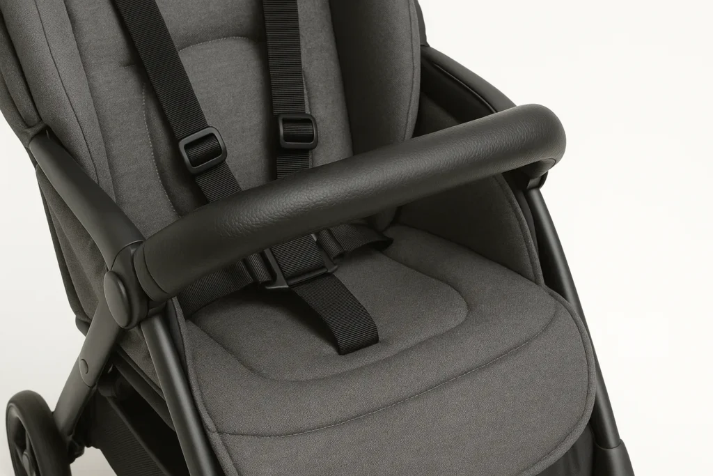 幌の端ギリギリや、折りたたみレバー付近におもちゃをつけると、たたむときに巻き込まれて破損したり、赤ちゃんの顔に勢いよく落ちてきたりするリスクがあります。説明書で「付属品を付けないでください」と書かれている場所には、基本的におもちゃも付けない方が安心です。