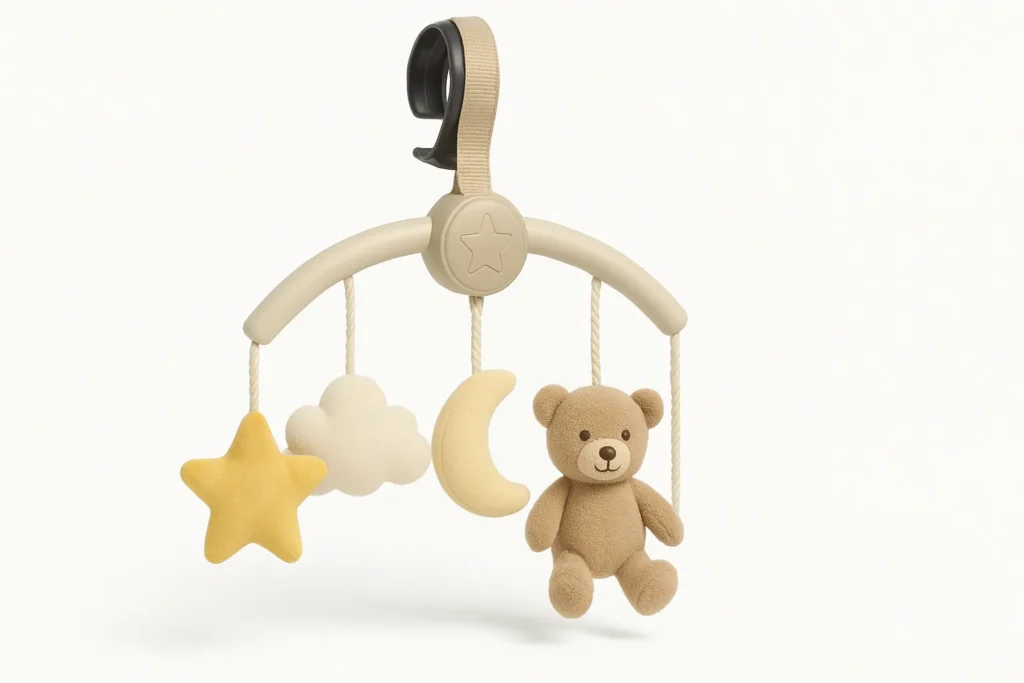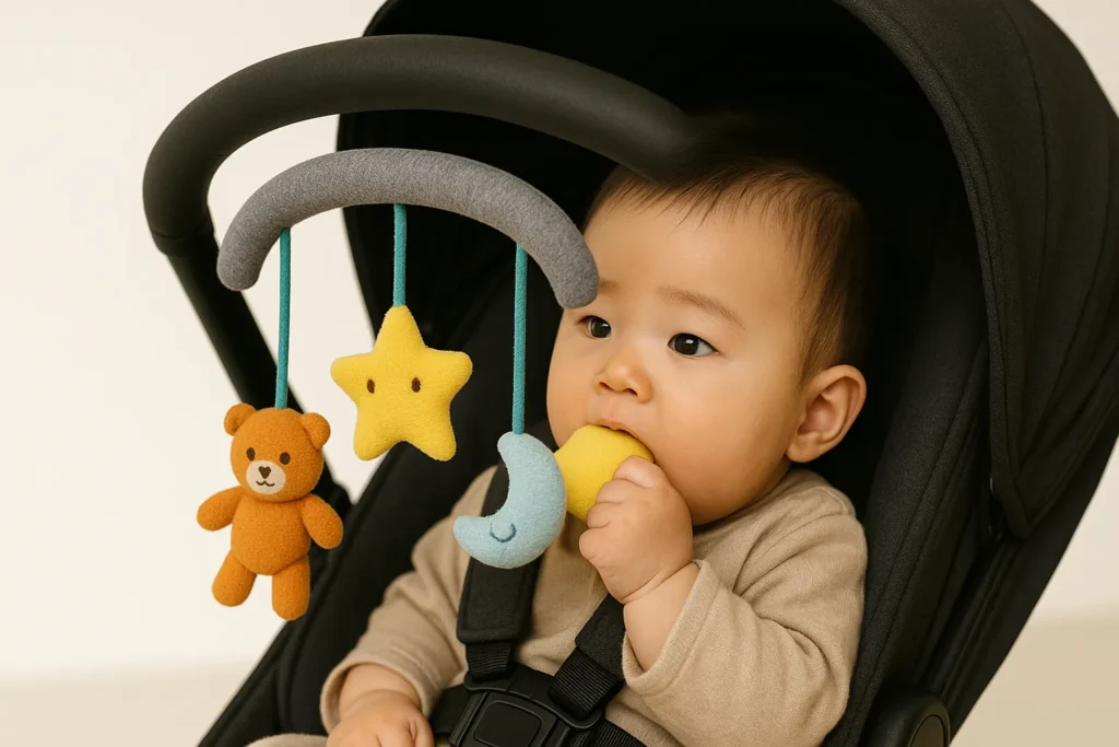 メリーがなくても、軽いラトルを2〜3個ローテーションしてつけるだけで、十分に楽しめる子もたくさんいます。「必ずメリーを買わなきゃ」と思い込みすぎず、ベビーカーの収納力やお出かけスタイルと相談して決めてあげるといいかなと思います。