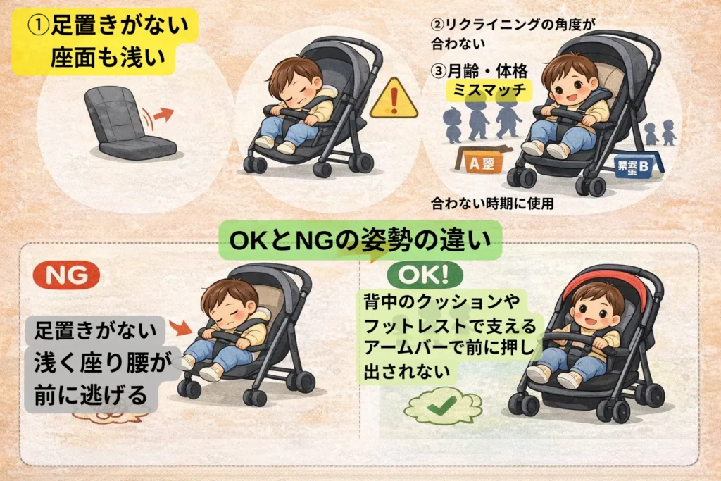 逆に、1歳前後で体が大きくなってきたのに、座面が浅めの軽量モデルを“長時間”使うと、前ずれが出て当たり前になりがちです。