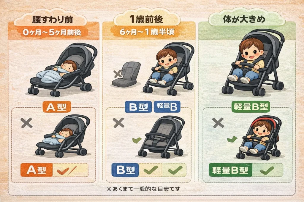 B型は基本的に、おすわりが安定してからが前提になりやすいです。