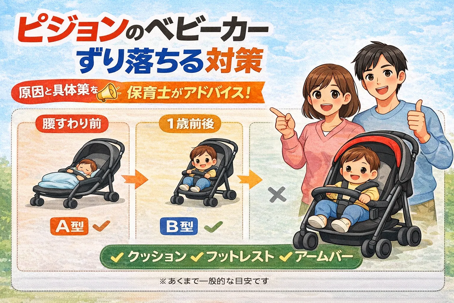 私も保育の現場で、軽量で押しやすいB型(ビングルみたいなタイプ)ほど「ずり落ちる対策が知りたい」という声をよく聞いてきました。