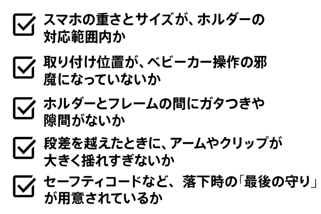 100均のスマホホルダーをベビーカーで使う前に、最低限チェックしてほしいポイントを、簡単なリストにまとめてみました。