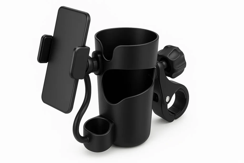 専用品は、ベビーカー用ドリンクホルダーとスマホホルダーが一体になっているものも多く、段差での揺れに配慮した作りになっています。