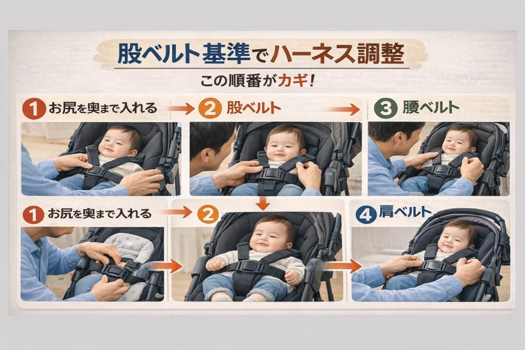 原因はだいたい「赤ちゃんの座らせ方」と「シートベルト(ハーネス)の締め方」の順番ミス。