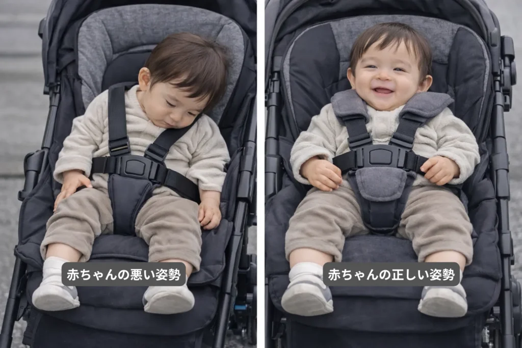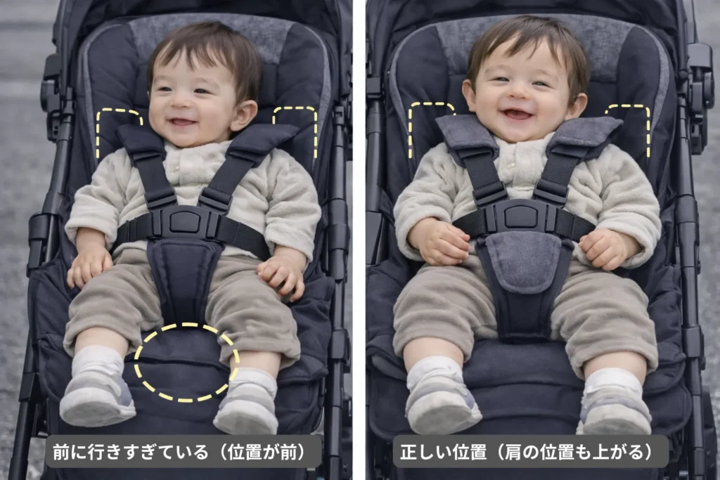 特にコンビは、エッグショック搭載やフラットに近い座面、体を包み込む設計が強みなぶん、股ベルトと肩ベルトの基準点を間違えると前ずれしやすく見えることがあります。