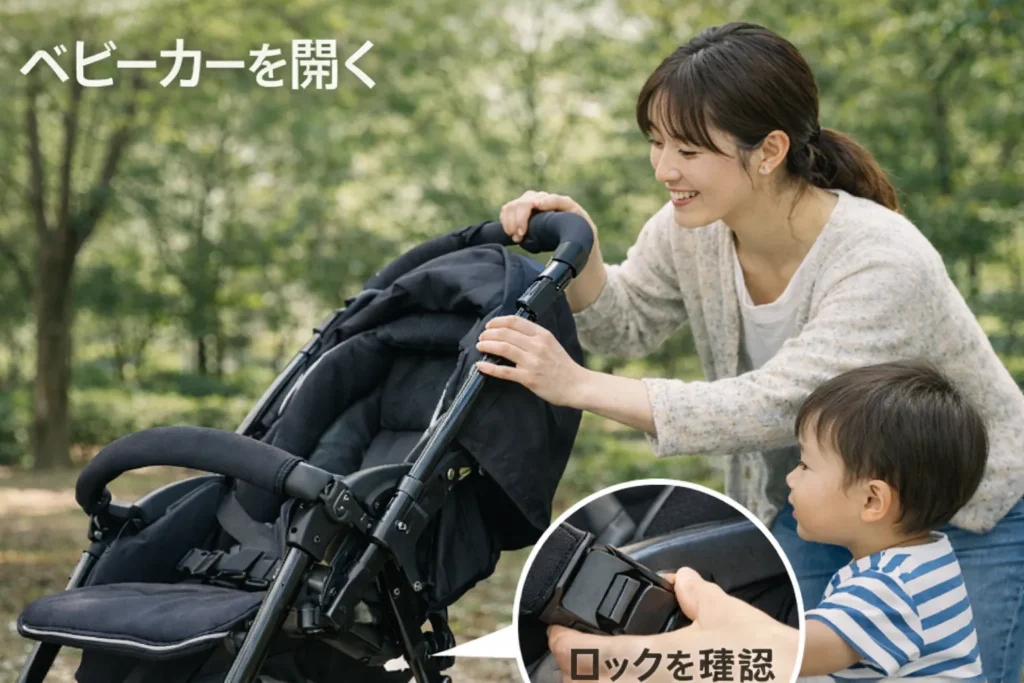 たとえば外出前は開き方とベルト調整、日差しが強い日は幌外し方や日除けの扱い、帰宅後はたたみ方、といった感じでOK。