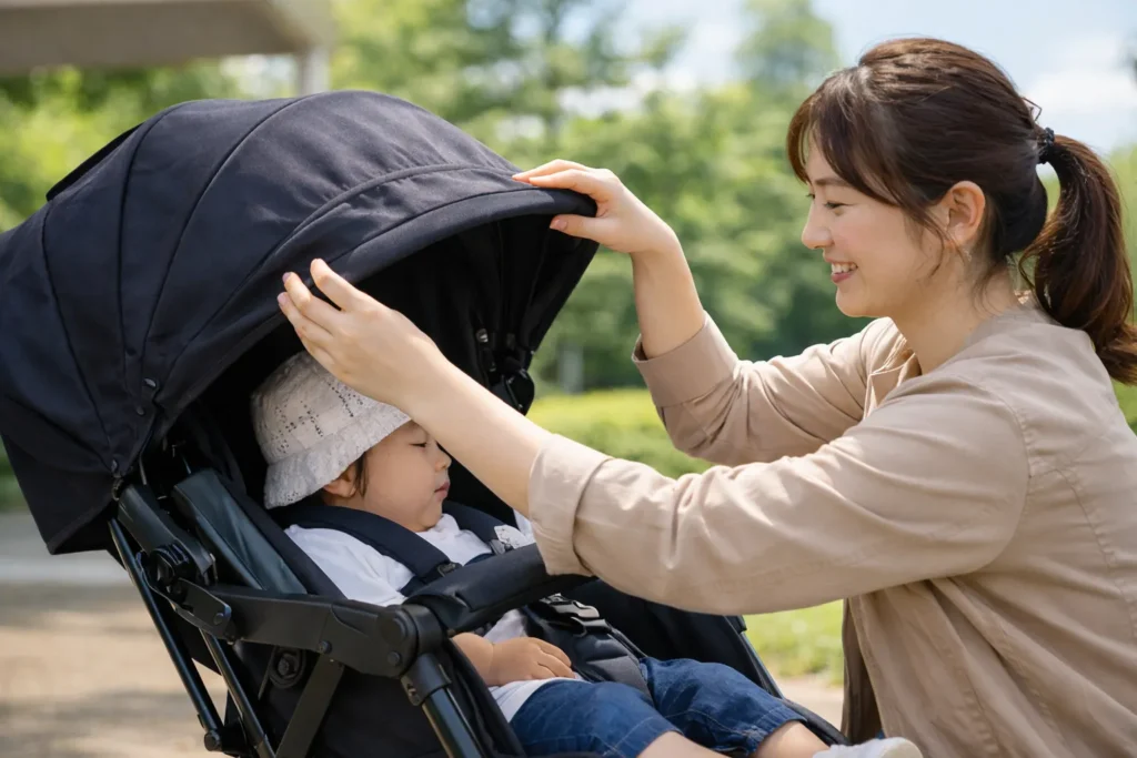 日差しが強い日や、室内で邪魔になるときに出てくるのが幌外し方と日除けの扱い。